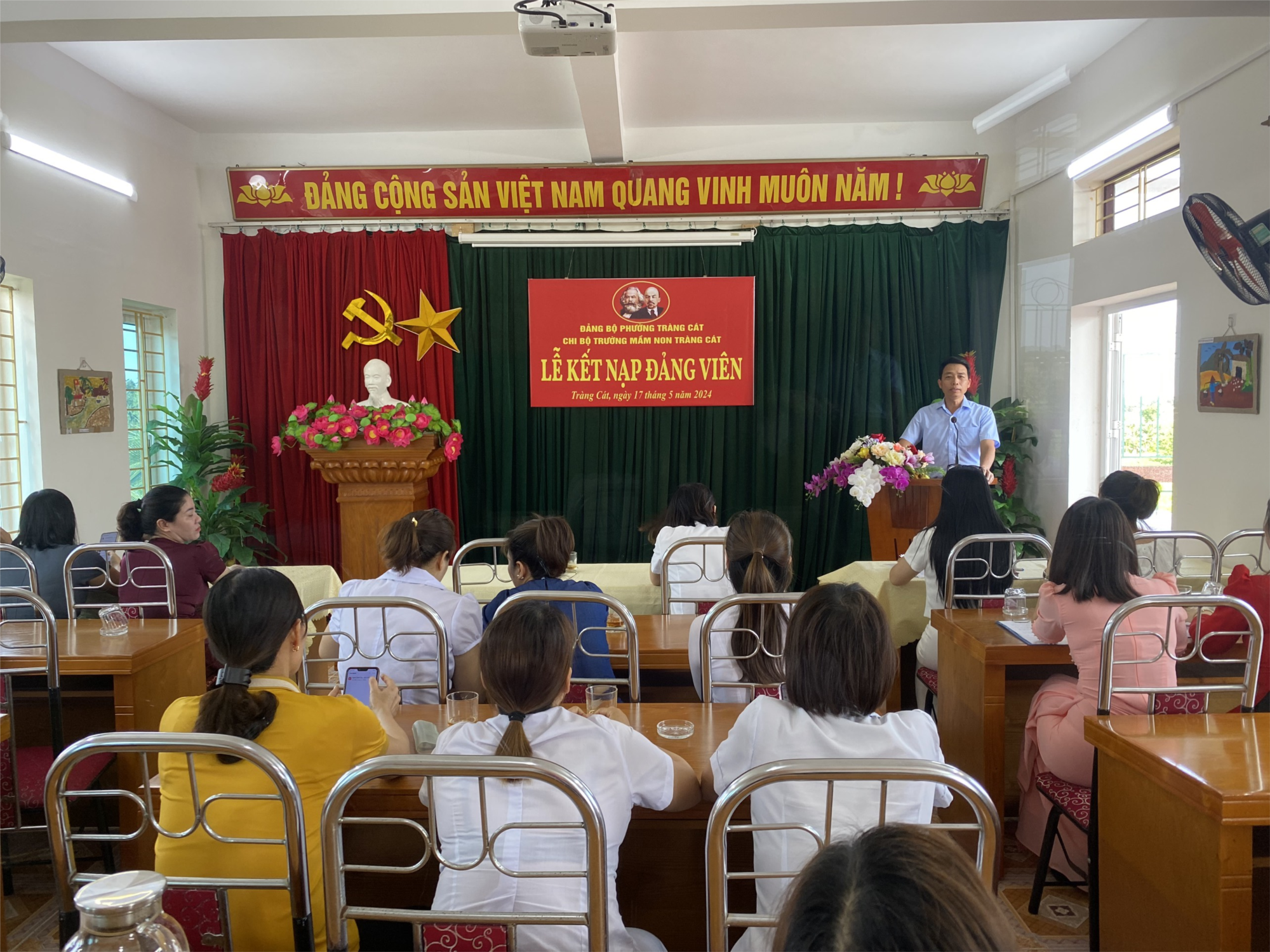 Xét Nghị quyết số 02 –NQ/CB ngày 02/05/2024 của Chi bộ Trường mầm non tràng Cát, Nghị quyết số 226-NQ/CB ngày 03/05/2024 của Đảng Ủy phường Tràng Cát về việc đề nghị kết nạp quần chúng Vũ Thị Nhâm, Nguyễn Thị Lạng, Nguyễn Thị Lan Anh vào Đảng, Căn cứ Nghị quyết số 1778-QĐ/QU của Quận ủy quận Hải An ngày 14/5/2024 Quyết định kết nạp đảng viên cho quần chúng Vũ Thị Nhâm, Nguyễn Thị Lạng, Nguyễn Thị Lan Anh. Chiều ngày 17/5 Chi bộ trường mầm non tổ chức lễ kết nạp đảng cho quần chúng Vũ Thị Nhâm, Nguyễn Thị Lạng, Nguyễn Thị Lan Anh được đứng trong hàng ngũ của Đảng .Về dự lễ kết nạp và chỉ đạo buổi lễ có đ/c Phan Văn Trường - Phó Bí thư thường trực đảng ủy phường, trong buổi lễ các Quần chúng Vũ Thị Nhâm, Nguyễn Thị Lạng, Nguyễn Thị Lan Anh đã nhận Quyết định do đc Bí thư chi bộ của nhà trường trao. Các Quần chúng Vũ Thị Nhâm, Nguyễn Thị Lạng, Nguyễn Thị Lan Anh đứng dưới chân dung Hồ Chủ Tịch đọc lời tuyên thệ khi đứng trong hàng ngũ của đảng, buổi lễ diễn ra trong bầu không khí trang nghiệm khi chi bộ đã thu nạp thêm 03 đồng chí trong hàng ngũ của Đảng xin chúc mừng các đồng chí luôn cố gắng hoàn thành xuất sắc nhiệm vụ của người Đảng viên. Sau đây là một số hình ảnh mà nhà trường đã lưu lại được.