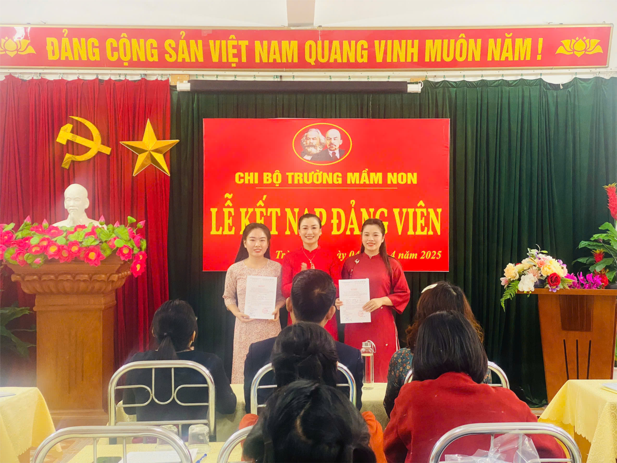 Xét Nghị quyết số 01 –NQ/CB ngày 22/02/2025 của Chi bộ Trường mầm non tràng Cát, Nghị quyết số 275-NQ/ĐU ngày 05/03/2025 của Đảng Ủy phường Tràng Cát về việc đề nghị kết nạp quần chúng Vũ Kim Dung, Nguyễn Thu Hương, Căn cứ Nghị quyết số 2202-QĐ/QU của Quận ủy quận Hải An ngày 20/3/2025 Quyết định kết nạp đảng viên cho quần chúng Vũ Kim Dung, Nguyễn Thu Hương. Chiều ngày 4/4 Chi bộ trường mầm non tổ chức lễ kết nạp đảng cho quần chúng Vũ Kim Dung, Nguyễn Thu Hương được đứng trong hàng ngũ của Đảng .Về dự lễ kết nạp và chỉ đạo buổi lễ có đ/c Phan Văn Trường - Phó Bí thư thường trực đảng ủy phường, trong buổi lễ các Quần chúng Vũ Kim Dung, Nguyễn Thu Hương đã nhận Quyết định do đc Bí thư chi bộ của nhà trường trao. Các Quần chúng Vũ Kim Dung, Nguyễn Thu Hương đứng dưới chân dung Hồ Chủ Tịch đọc lời tuyên thệ khi đứng trong hàng ngũ của đảng, buổi lễ diễn ra trong bầu không khí trang nghiệm khi chi bộ đã thu nạp thêm 02 đồng chí trong hàng ngũ của Đảng xin chúc mừng các đồng chí luôn cố gắng hoàn thành xuất sắc nhiệm vụ của người Đảng viên. Sau đây là một số hình ảnh mà nhà trường đã lưu lại được.