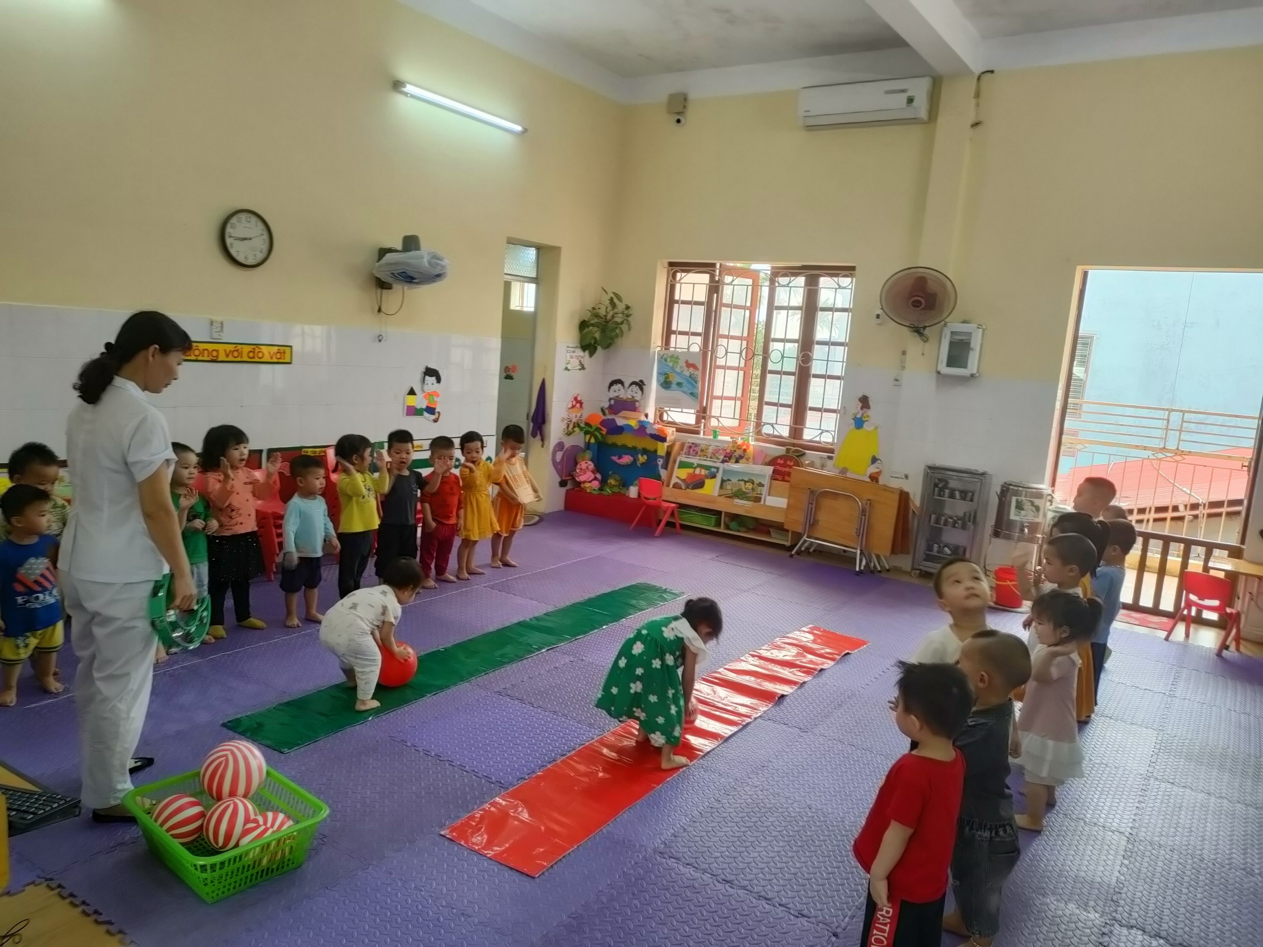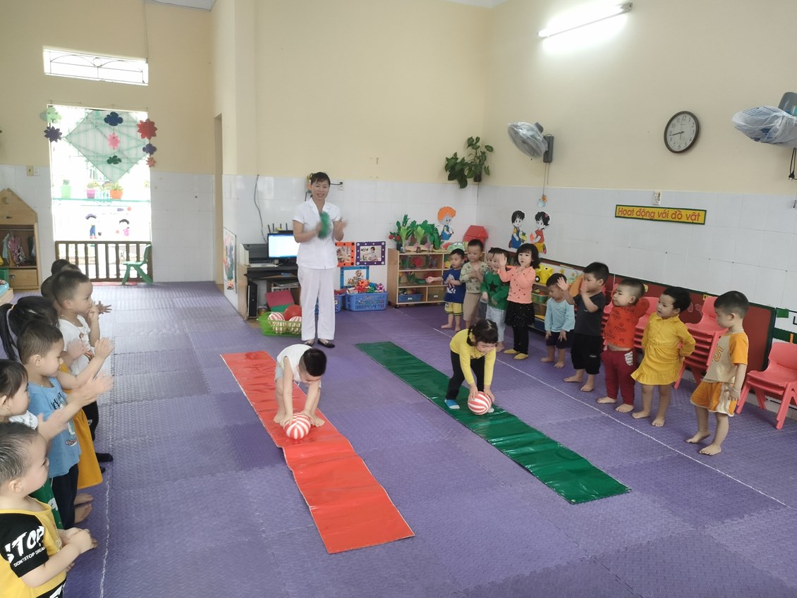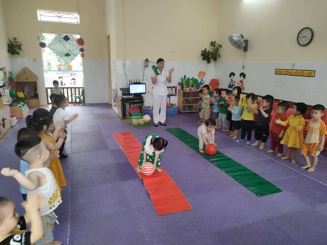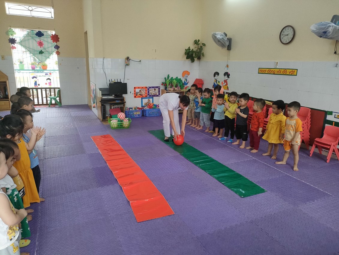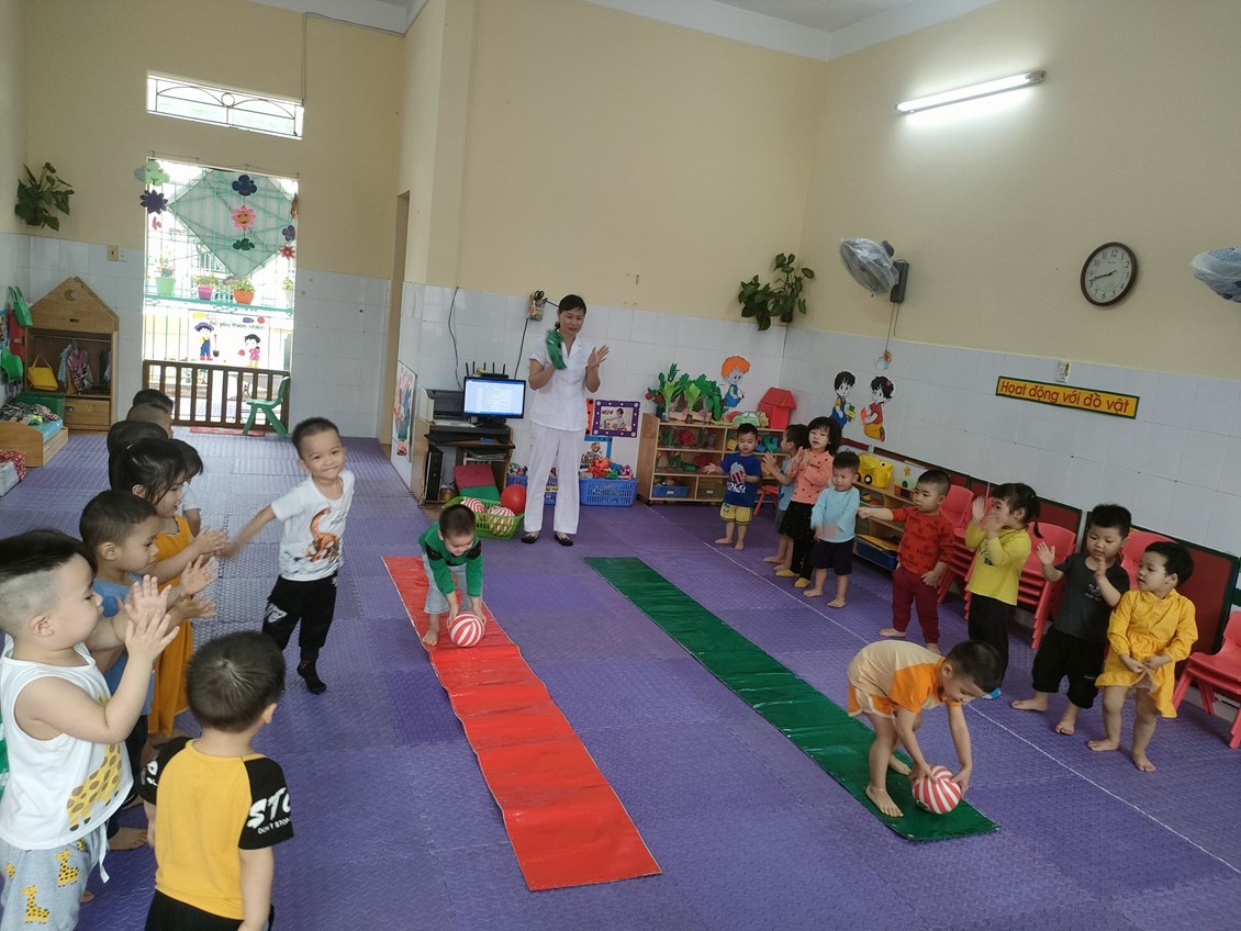 Vận động "lăn bóng trong đường hẹp" giúp trẻ phát triển cơ chân, cơ tay, rèn luyện sự phối hợp chân và mắt, tay và mắt, rèn luyện khả năng giữ thăng bằng khi đi trong đường hẹp, không đi ra ngoài. Qua vận động phát triển khả năng chú ý có chủ đích. Ở lớp thật vui cô giáo đã giúp bé được rèn luyện vận động qua các bài tập vận động và các trò chơi. Từ đó, vận động của các bé 24-36 tháng trở nên trẻ trở nên hoạt bát nhanh nhẹn, khéo léo giúp trẻ sảng khoái, tinh thần vui vẻ và tự tin hơn. Sau đây là một số hình ảnh mà cô giáo đã lưu lại được