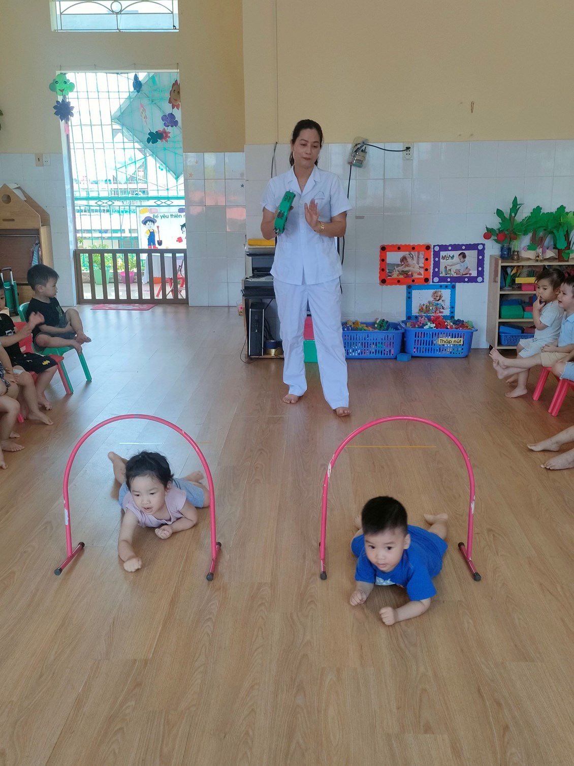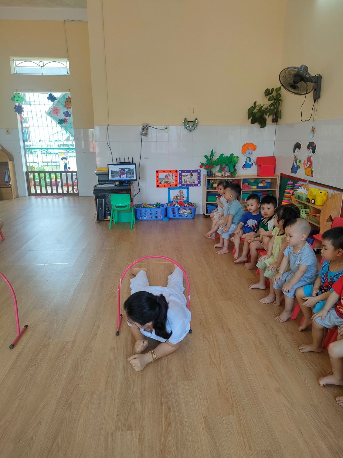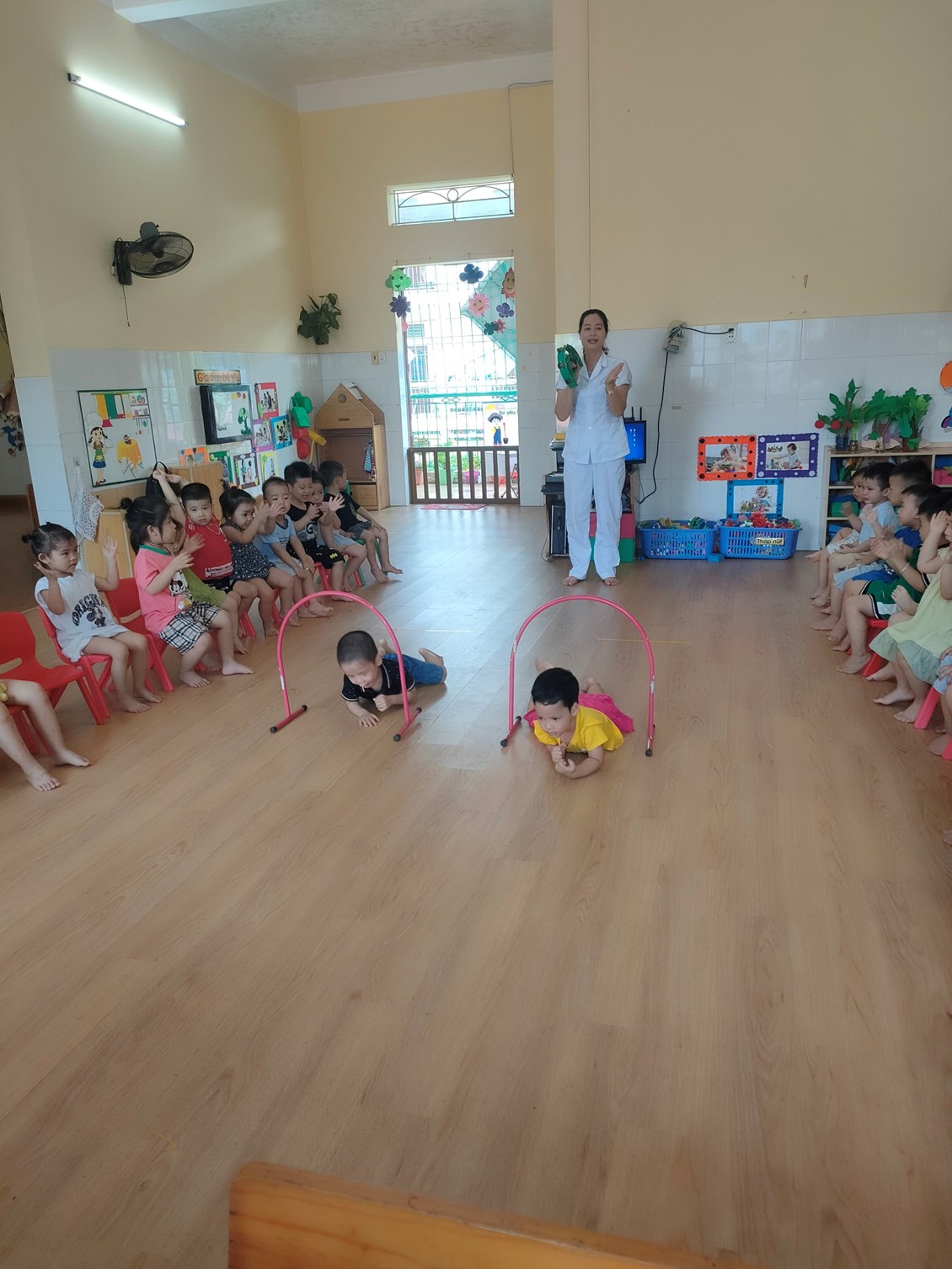 Trong quá trình giáo dục thể chất cho trẻ mầm non, các nhiệm vụ giáo dục thể chất được hoàn thành bằng các hình thức khác nhau. Hình thức giáo dục thể chất ở trường mầm non là sự tổng hợp giáo dục về những hoạt động vận động nhiều dạng của trẻ, mà cơ bản là tính tích cực vận động của chúng. Sự tổng hợp những hình thức đó tạo nên một chế độ vận động nhất định, cần thiết cho sự phát triển đầy đủ về thể chất và củng cố sức khỏe cho trẻ. Ở trường mầm non sử dụng hình thức giáo dục thể chất qua các tiết học thể dục “bò chui qua cổng” do cô Nguyễn Thị Nhinh dạy các bé lớp NT2, trong giờ học các bé có kỹ năng lăn và được rèn luyện sức khỏe, giờ học thật là vui vẻ qua các hình ảnh mà các cô đã lưu lại được.