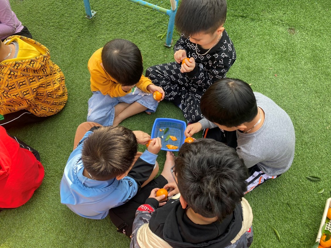 Hôm nay các bạn nhỏ lớp 5 tuổi đã có một giờ học kỹ năng hết sức thú vị. Các con đã được cô giáo hướng dẫn kỹ năng bóc vỏ quýt