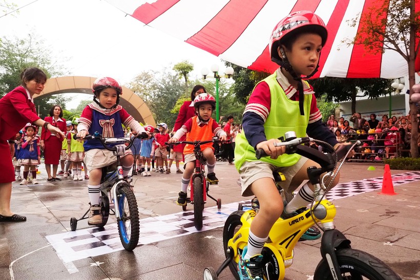 Phần thi "Chung sức" các bé sẽ được chơi cùng các phụ huynh phối hợp ăn ý vượt qua các chướng ngại vật đội mũ bảo hiểm cho trẻ đạp xe về đích an toàn.