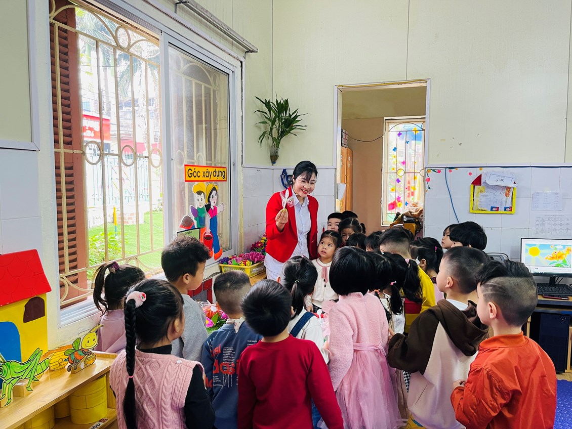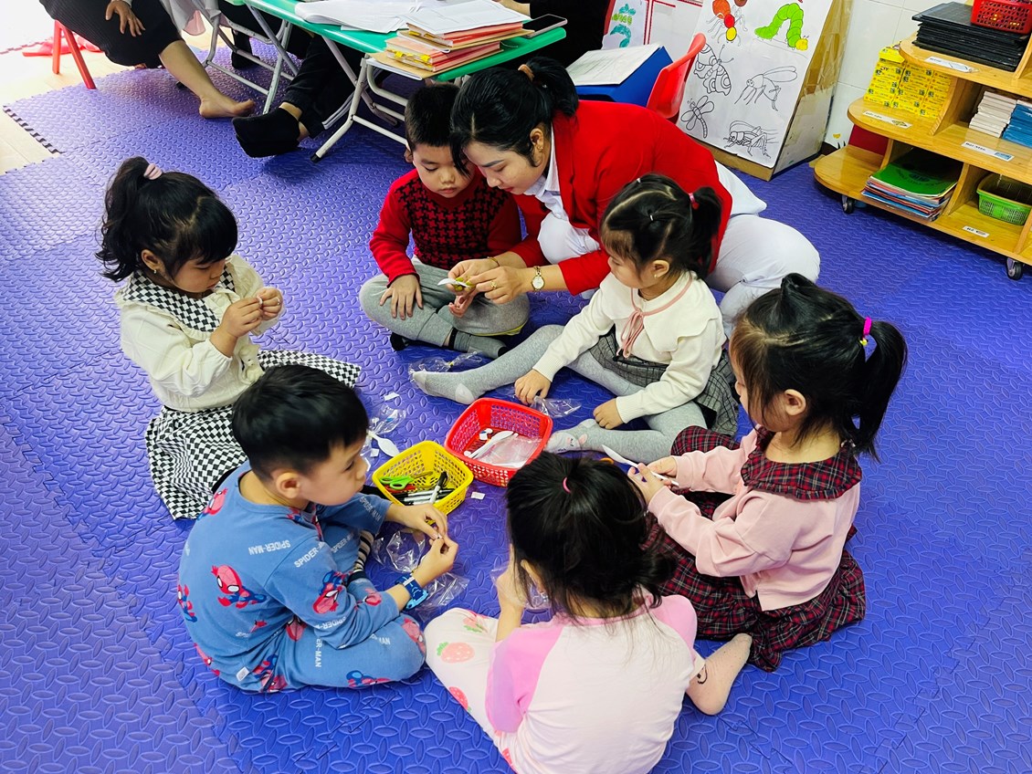 Giáo viên Mầm non ngoài việc chăm cho ăn, cho ngủ, giáo dục trẻ trở thành những đứa trẻ lễ phép, ngoan ngoãn thôi chưa đủ, mà nhiệm vụ của giáo viên mầm non còn phải trang bị cho trẻ những kiến thức, kỹ năng ban đầu thông qua các hoạt động giáo dục. Như chúng ta đã biết, vui chơi là hoạt động chủ đạo trong các trường, lớp mầm non. Để thực hiện hoạt động vui chơi phải có đồ chơi. Đồ chơi có tác dụng lớn lao đến việc hình thành và phát triển nhân cách trẻ. Chính những đồ chơi giúp trẻ được thao tác, được hoạt động, trải nghiệm, được thể hiện những nhu cầu cá nhân, được phát triển cân đối hài hòa, từ đó giúp trẻ phát triển toàn diện về mọi mặt, để trẻ có một tâm thế tự tin để bước vào lớp một. Đối với trẻ nhỏ, đồ chơi là một nhu cầu thiết yếu, không thể thiếu được trong cuộc sống. Nó cần cho trẻ như thức ăn, nước uống. Đồ chơi hết sức cần thiết đối với trẻ, nó có tác dụng và ý nghĩa thật to lớn, sâu sắc đối với trẻ độ tuổi mầm non, vì bất kể một trẻ em nào đều có nhu cầu chơi và rất yêu quí đồ chơi, trẻ sống và hành động cùng với đồ chơi. Đồ chơi giúp trẻ em tìm hiểu, khám phá thế giới xung quanh, giúp trẻ làm quen với những đặc điểm, tính chất của nhiều đồ vật, biết được công dụng của chúng trong sinh hoạt và trong lao động của con người. Đồ chơi còn là phương tiện giúp trẻ phát hiện ra những mối quan hệ của người với người trong xã hội dần dần biết gia nhập vào các mối quan hệ đó. Hoạt động với đồ chơi vừa làm thỏa mãn nhu cầu vui chơi, vừa làm cho đôi bàn tay khéo léo, đôi chân dẻo dai cơ thể mềm mại, hình dáng phát triển cân đối hài hòa, vừa chuẩn bị kiến thức, kỹ năng cho trẻ học các cấp học trên vừa có thể tham gia tốt vào cuộc sống xã hội sau này. Hôm nay các bé lớp 4b2 thực hiện hoạt động học làm những chú bướm sinh trong chủ điểm một số loại côn trùng do cô giáo Bùi Thị Luyến hướng dẫn, trong giờ học trẻ rất hứng thú tích cự tham gia để tạo ra sản phẩm của mình. Sau đây là một số hình ảnh mà giáo viên đã lưu lại được trong giờ học.