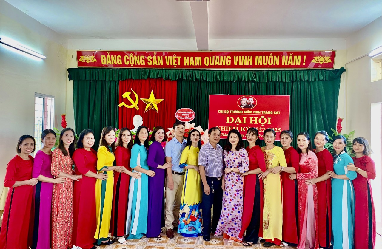 Thực hiện Thông tri số 06-TT/QU ngày 31/03/2022 của ban Thường vụ Quận uỷ Hải An. Thực hiện Kế hoạch số 13-KH/ĐU ngày 05/5/2022 của Đảng uỷ phường Tràng Cát về Đại hội chi bộ nhiệm kỳ 2022 -2025. Ngày 17/9/2022 trường MN Tràng Cát long trọng tổ chức Đại hội chi bộ nhiệm kỳ 2022 -2025, nhằm đánh kết quả hoạt động của Chi bộ trong nhiệm kỳ vừa qua, đồng thời bầu ra Ban chi uỷ mới và các chức danh chủ chốt trong Chi bộ. Về dự và chỉ đạo Đại hội có đồng chí: Vũ Tuấn - Phó bí thư Đảng uỷ - Chủ tịch UBND phường và các đồng chí trong tổ công tác số 3. Đại hội diễn ra thành công tốt đẹp trong bầu không khí vui tươi phấn khởi của các đồng chí Đảng viên trong Chi bộ. Sau đây là một số hình ảnh: